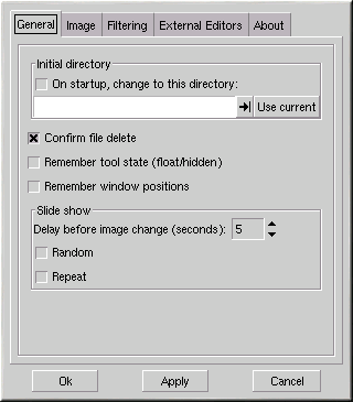 The configuration pop-up menu allows advanced users to configure several options. You can customize a directory on startup, change thumbnail sizes, and even change the default image editors to manipulate the file if you would like to use one that is not listed.