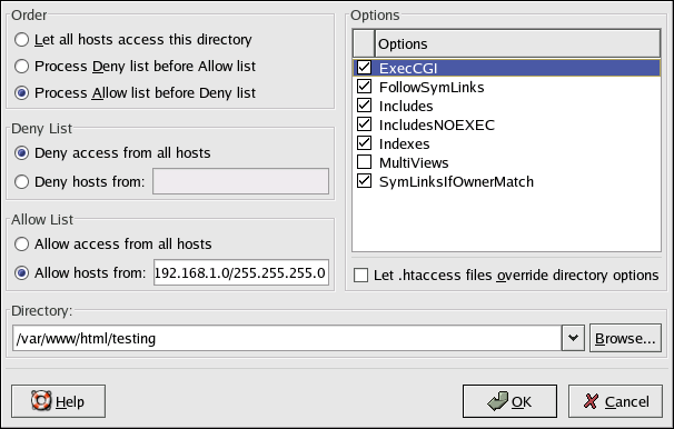 To specify options for specific directories, click the Add button beside the Directory list box. The window shown in Figure 18-7 appears. Enter the directory to configure in the Directory text field at the bottom of the window. Select the options in the right-hand list, and configure the Order directive with the left-hand side options. The Order directive controls the order in which allow and deny directives are evaluated. In the Allow hosts from and Deny hosts from text field, you can specify one of the following: