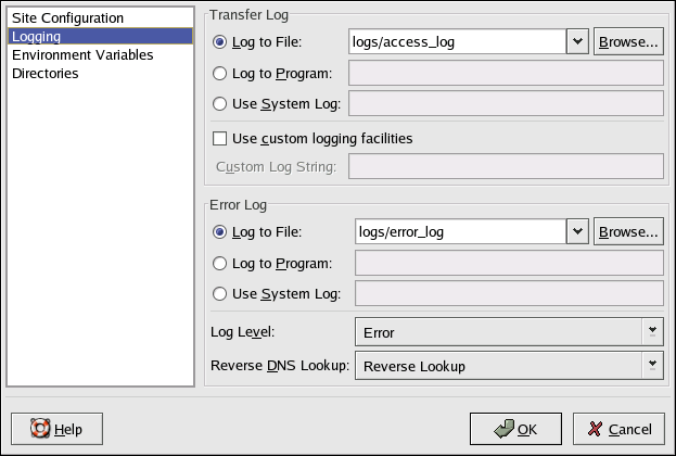 The transfer log contains a list of all attempts to access the Web server. It records the IP address of the client that is attempting to connect, the date and time of the attempt, and the file on the Web server that it is trying to retrieve. Enter the name of the path and file in which to store this information. If the path and filename does not start with a slash (/), the path is relative to the server root directory as configured. This option corresponds to the TransferLog directive.