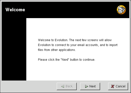 The first time you start Evolution you will be presented with the Welcome Screen (Figure 6-1), which allows you to configure your email connection. Follow the on-screen instructions and fill in the information you collected from your ISP or administrator in the text boxes provided. When you are done, click Finish, and you will be presented with the Main Screen as shown in Figure 6-2.