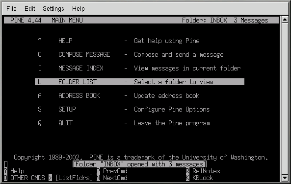 To launch Pine, type pine at a shell prompt. After starting Pine, the Main Menu screen appears.