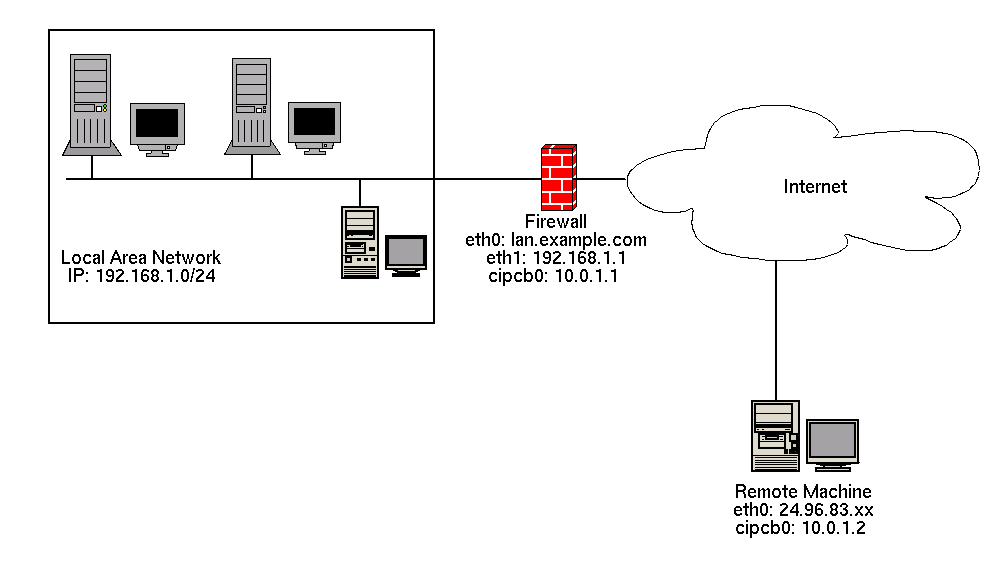 This guide details a sample configuration involving a workstation client that wishes to connect securely to a remote LAN with a CIPE gateway. The workstation uses a dynamic IP address via cable modem connection, while the CIPE-enabled gateway machine employs the 192.168.1.0/24 range. This is what is known as a "typical" CIPE configuration. The following diagram illustrates the network architecture for this CIPE configuration: