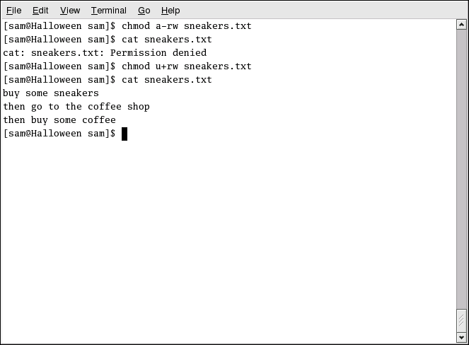 [sam@halloween sam]$ chmod u+rw sneakers.txt [sam@halloween sam]$ cat sneakers.txt buy some sneakers then go to the coffee shop then buy some coffee bring the coffee home take off shoes put on sneakers make some coffee relax! [sam@halloween sam]$ |