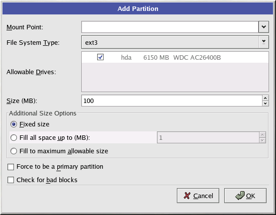 Using your mouse, click once to highlight a particular field in the graphical display. Double-click to edit an existing partition or to create a partition out of existing free space.