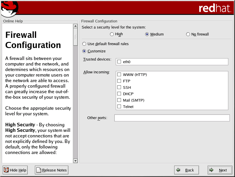 No firewall provides complete access to your system and does no security checking. Security checking is the disabling of access to certain services. This should only be selected if you are running on a trusted network (not the Internet) or plan to do more firewall configuration later.