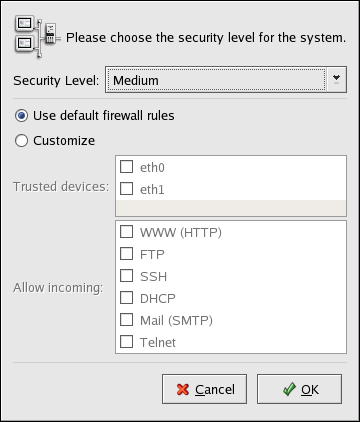 After installation, you can change the security level of your system by using the Security Level Configuration Tool. If you prefer a wizard-based application, refer to Section 13.2 GNOME Lokkit.