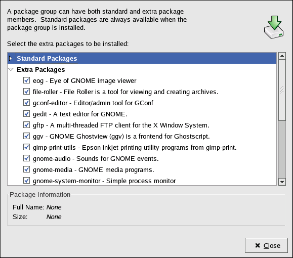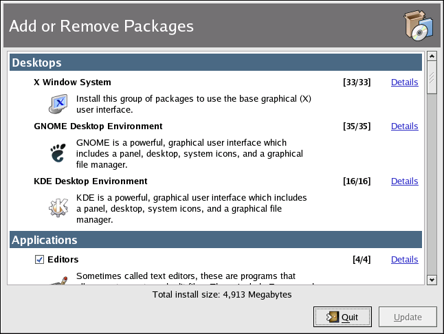 The interface for this application is similar to the one used during installation. Packages are divided into package groups, which contain a list of standard packages and extra packages that share common functionality. For example, the Graphical Internet group contains a Web browser, email client, and other graphical programs used to connected to the Internet. The standard packages can not be selected for removal unless the entire package group is removed. The extra packages are optional packages that can be selected for installation or removal, as long as the package group is selected.