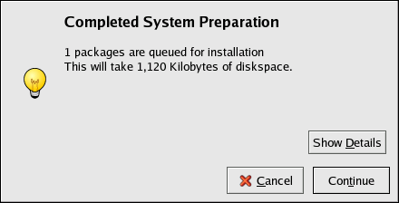 After selecting package groups and individual packages to install, click the Update button on the main window. The application will then compute the amount of disk space required to install the packages as well as any package dependencies and display a summary window. If there are package dependencies, they will be automatically added to the list of packages to install. Click the Show Details button to view the complete list of packages to be installed.
