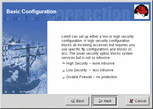 High Security — This option disables almost all network connects except DNS replies and DHCP so that network interfaces can be activated. IRC, ICQ, and other instant messaging services as well as RealAudio™ will not work without a proxy.
