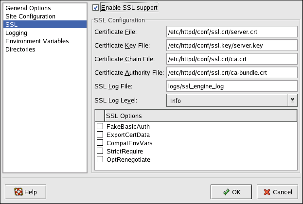 If an Apache HTTP Server is not configured with SSL support, communications between an Apache HTTP Server and its clients are not encrypted. This is appropriate for websites without personal or confidential information. For example, an open source website that distributes open source software and documentation has no need for secure communications. However, an ecommerce website that requires credit card information should use the Apache SSL support to encrypt its communications. Enabling Apache SSL support enables the use of the mod_ssl security module. To enable it through HTTP Configuration Tool you must allow access through port 443 under the Main tab => Available Addresses. Refer to Section 19.1 Basic Settings for details. Then, select the virtual host name in the Virtual Hosts tab, click the Edit button, choose SSL from the left-hand menu, and check the Enable SSL Support option as shown in Figure 19-9. The SSL Configuration section is pre-configured with the dummy digital certificate. The digital certificate provides authentication for your secure Web server and identifies the secure server to client Web browsers. You must purchase your own digital certificate. Do not use the dummy one provided in Red Hat Linux for your website. For details on purchasing a CA-approved digital certificate, refer to the Chapter 20 Apache HTTP Secure Server Configuration.