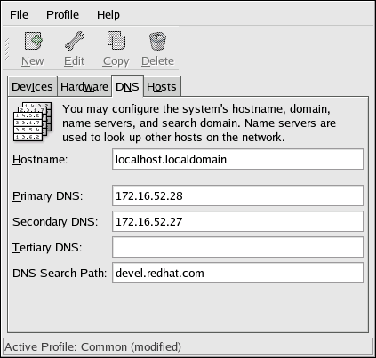 The DNS tab allows you to configure the system's hostname, domain, name servers, and search domain. Name servers are used to look up other hosts on the network.