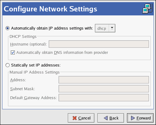 In the Configure Network Settings window as shown in Figure 12-2, choose between DHCP and a static IP address. If the device receives a different IP address each time the network is started, do not specify a hostname. Click Forward to continue.