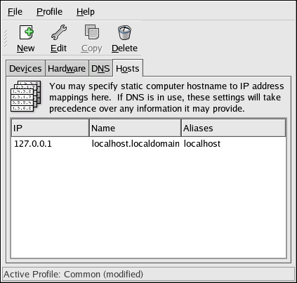 The Hosts tab allows you to add, edit, or remove hosts from the /etc/hosts file. This file contains IP addresses and their corresponding hostnames.