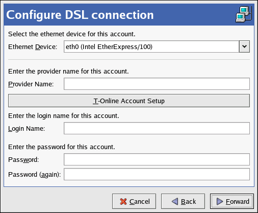 6. Enter the Provider Name, Login Name, and Password. If you have a T-Online account, instead of entering a Login Name and Password in the default window, click the T-Online Account Setup button and enter the required information. Click Forward to continue.