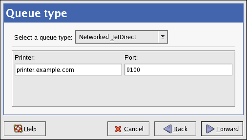 Select Networked JetDirect from the Select a queue type menu, and click Forward.
