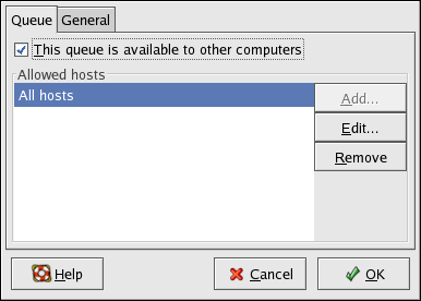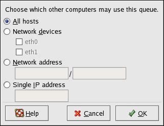 After selecting to share the queue, by default, all hosts are allowed to print to the shared printer. Allowing all systems on the network to print to the queue can be dangerous, especially if the system is directly connected to the Internet. It is recommended that this option be changed by selecting the All hosts entry and clicking the Edit button to display the window shown in Figure 27-18.