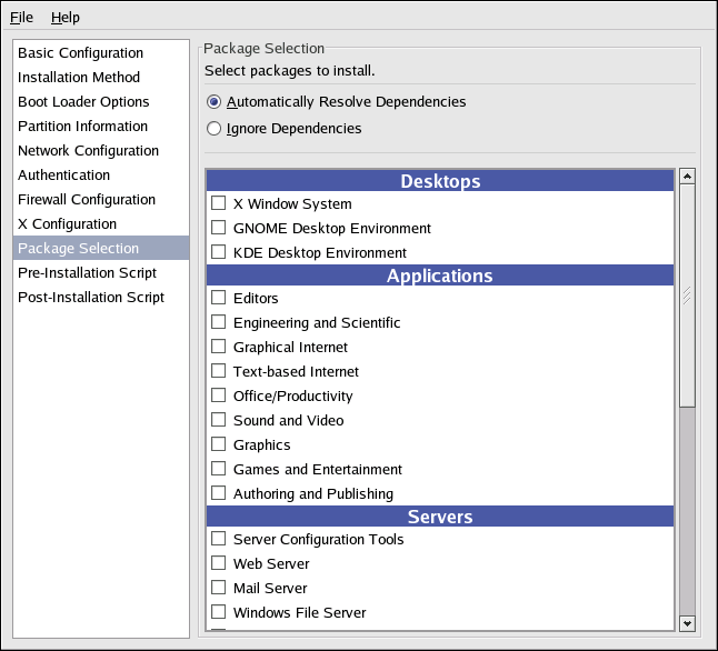 Currently, Kickstart Configurator does not allow you to select individual packages. To install individual packages, modify the %packages section of the kickstart file after you save it. Refer to Section 7.5 Package Selection for details.