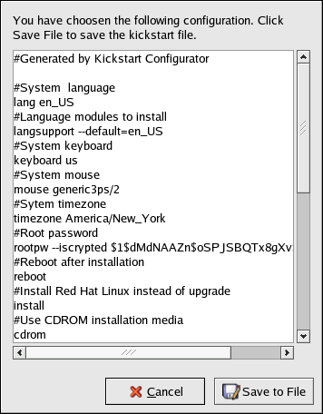 After saving the file, refer to Section 7.10 Starting a Kickstart Installation for information on how to start the kickstart installation.
