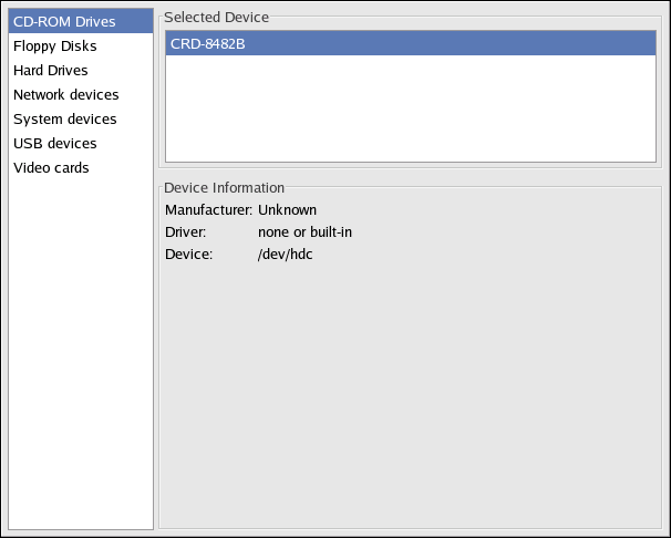 If you are having trouble configuring your hardware or just want to know what hardware is in your system, you can use the Hardware Browser application to display the hardware that can be probed. To start the program from the desktop, select Main Menu Button => System Tools => Hardware Browser or type hwbrowser at a shell prompt. As shown in Figure 26-3, it displays your CD-ROM devices, floppy disks, hard drives and their partitions, network devices, pointing devices, system devices, and video cards. Click on the category name in the left menu, and the information will be displayed.