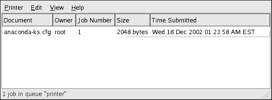 When you send a print job to the printer daemon, such as printing text file from Emacs or printing an image from The GIMP, the print job is added to the print spool queue. The print spool queue is a list of print jobs that have been sent to the printer and information about each print request, such as the status of the request, the username of the person who sent the request, the hostname of the system that sent the request, the job number, and more.