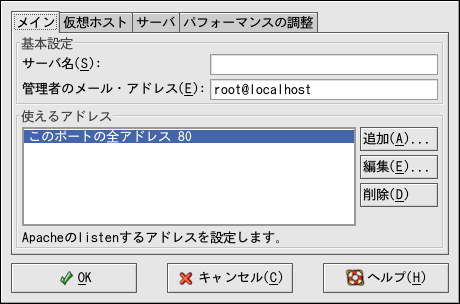 HTTP 設定ツールを使用すると、Apache HTTP サーバー用の設定ファイルである/etc/httpd/conf/httpd.confを 設定することが出来ます。古いsrm.confファイルや access.confファイルは使用しないで、空の ままにしておきます。グラフィカルインターフェイスを通して、仮想ホスト、ログの属性、及び接続の最大数などのディレクティブが設定できます。