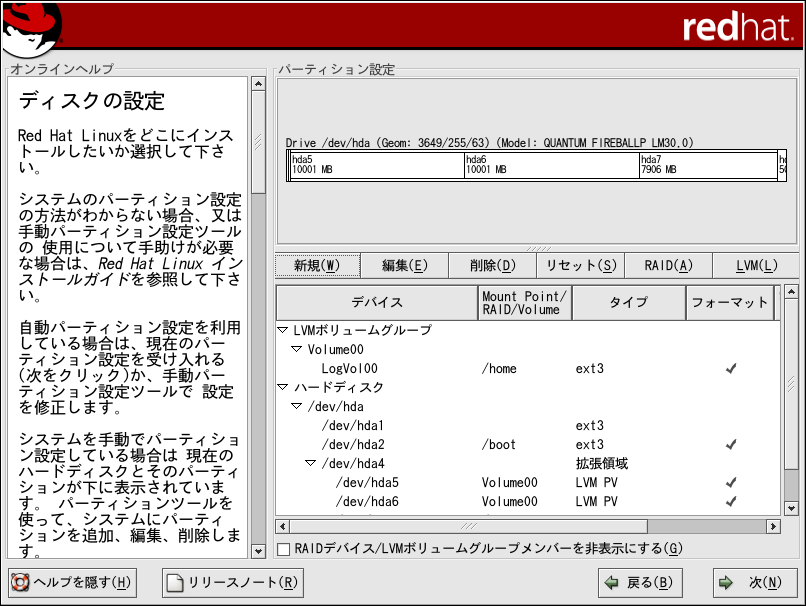 LVM はRed Hat Linuxのグラフィカルインストール時、又はキックスタートインストール時に 設定することが出来ます。lvmパッケージのユーティリティを 使用すれば LVM設定を作成する事が出来ます。但し、その手順案内は、 Red Hat Linuxインストール時の Disk Druid使用に焦点を置いてこの作業を完了する説明に なっています。