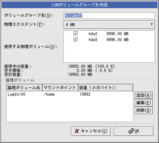 ボリュームグループのすべての論理ボリュームは物理エクステント単位で 割り当てる必要があります。デフォルトでは、物理エクステントは4 MBに設定してあります。 その為、論理ボリュームの容量は4 MBで割り切れる数字でなければなりません。4 MB単位ではない 容量を入力した場合、インストールプログラムは自動的に近い4MB単位の容量を選択します。この 設定を変更することは推薦できません。