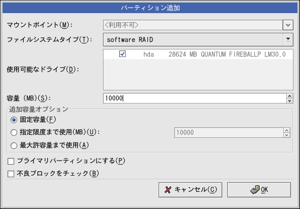 固定容量を選択して、指定のサイズの物理ボリュームを作成するか、 指定限度まで使用 (MB)を選択して物理ボリュームの 範囲を指定するサイズをメガバイト数で入力するか、あるいは最大許容量まで使用を 選択してハードディスク上の使用可能な全容量まで後で成長するようにもできます。 1つ以上を成長可能にするとそれらの物理ボリューム同士でディスク上の空き領域を共有することになります。