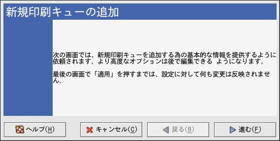 コンピュータのパラレルポート、あるいはUSBポートに接続されているローカルプリンタを 追加するには、メインのプリンタ設定ツールウィンドウ内で 新規ボタンをクリックして図27-2に 示すようなウィンドウを出します。そして進むボタンをクリックして 続けます。