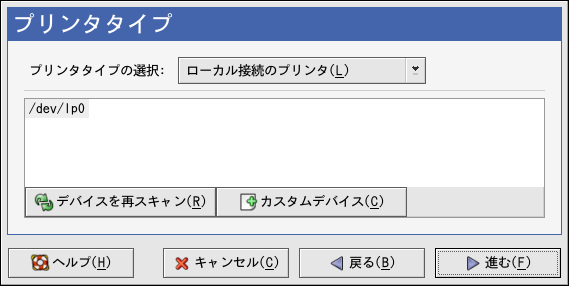 進むボタンをクリックすると、図27-4が表示されます。プリンタタイプの 選択メニューからローカル接続のプリンタを選択します。 デバイスは通常、パラレルプリンタ用には/dev/lp0であり、 USBプリンタ用には/dev/usb/lp0です。一覧にデバイス名が 表示されない場合は、デバイスを再スキャンボタンをクリック してコンピュータを再スキャンするか、又はカスタムデバイスボタンを クリックして、手動でそれを指定します。進むボタンをクリックして 続けます。