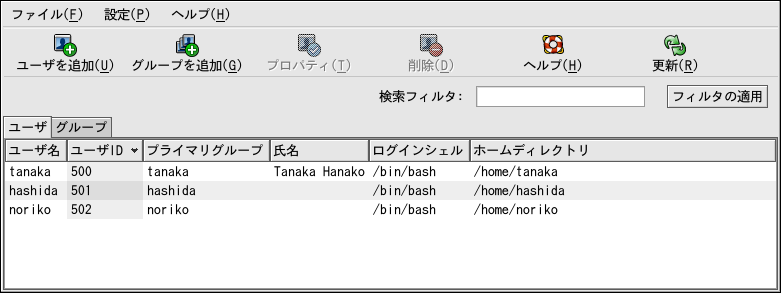 Red Hat Linuxは、500までのユーザーIDをシステムユーザー用に予約しています。デフォルトでは、ユーザーマネージャはシステムユーザーを表示しません。システムユーザーを含め、すべてのユーザーを表示するには、プルダウンメニューから設定 - システムユーザーとグループをフィルタの順に進みチェックをはずします。