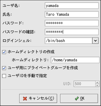 ログインシェルを選択します。どのシェルを選んでよいのかわからない場合は、/bin/bashのデフォルト値を使用します。デフォルトのホームディレクトリは/home/ユーザー名です。ユーザーのために作られたホームディレクトリは変更でき、又、ホームディレクトリの作成の選択を解除して、ホームディレクトリを作成しないようにもできます。