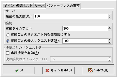 パフォーマンスの調整タブでは、子サーバープロセスの最大数やクライアント接続のApache HTTP サーバーオプションを 設定できます。通常の使用では、これらのオプションにはデフォルト値を設定しておけば十分に動作します。これらの設定値を変更すると、 Webサーバー全体のパフォーマンスに影響が及びます。