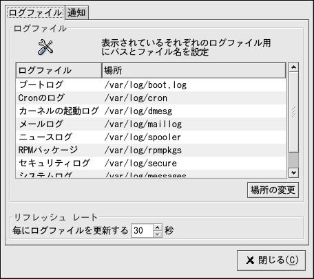 デフォルトでは、現在表示できるログファイルは30秒毎に 更新されています。この更新レートを変更するには、 プルダウンメニューから編集 => 設定と選択していきます。 図29-2に示して あるウィンドウが出てきます。ログファイル タブで、更新レートの横にある上下の矢印を クリックして変更します。閉じる をクリックしてメインのウィンドウに戻ります。 更新レートが直ちに変更になります。手動で現在表示できる ファイルを更新するには、ファイル =>今すぐ更新 と選択するか、または[Ctrl][R ]キーを同時に押します。