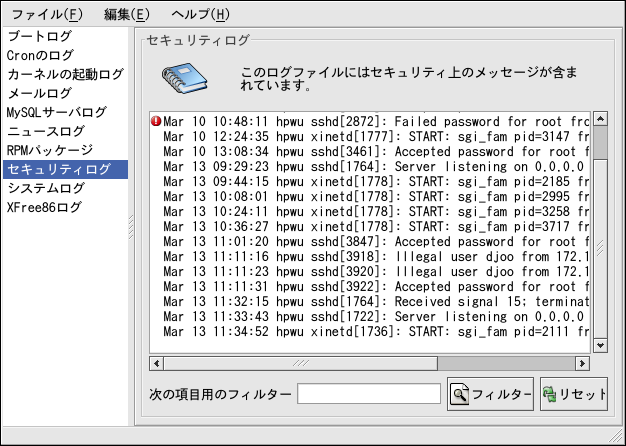 インテラクティブでリアルタイムのアプリケーションで システムログファイルを表示するには、 ログ ビューアを使います。 このアプリケーションを開始するには、(パネル上の) メインメニューボタン=> システムツール=>システムの ログと進みます。または、シェルプロンプト でredhat-logviewerとコマンドを入力 します。