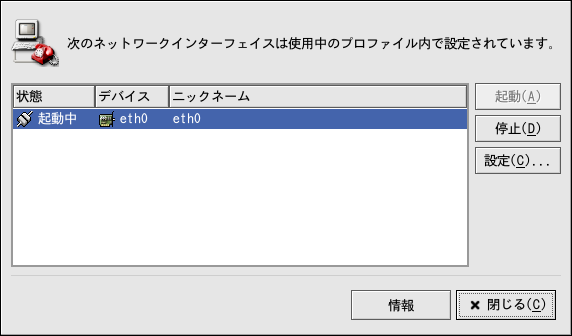ネットワークデバイスはブート時に起動する、または起動しないよう に設定することができます。例えば、モデム接続用のネットワーク デバイスは通常、ブート時に起動するように設定されていませんが、 イーサネット接続は通常、ブート時に起動するようになっています。 ご使用のネットワークデバイスがブート時に起動しない設定になって いる場合は、Red Hat コントロールネットワーク を使用して、ブートしたら起動するようにできます。 この設定を始めるには、(パネル上の)メインメニューボタン => システムツール => ネットワークデバイスのコントロールと選択して いきます。または、redhat-control-networkと コマンドを入力します。