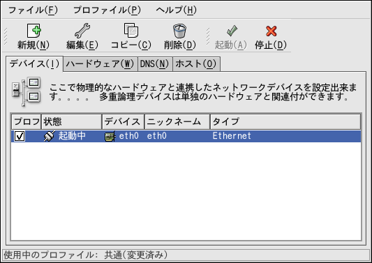 通常、インストールプログラムによって、サポートされて いるイーサネットデバイスが検出され、設定をするように 求められます。イーサネットデバイスをインストール時に設定 した場合は、ハードウェアタブの ハードウェア一覧に表示されます。 |