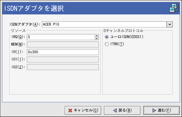 プルダウンメニューからISDNアダプタを選択します。 アダプタ用のリソースとDチャンネルプロトコルを設定します。 進むボタンをクリックして続行します。