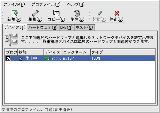 ISDNデバイスを追加したら、デバイスの一覧からデバイスを選択 して編集をクリックすると、設定を 編集することができます。たとえば、デバイスを追加したときに、 デフォルトでは起動時に実行が開始されないように設定されます。 この設定を編集して変更することができます。圧縮、 PPPオプション、ログイン名、パスワードなども変更することが できます。