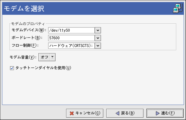 モデムデバイス、ボードレート、フロー制御、 モデム音量を設定します。値がわからない場合は、モデムが 正常に検索されたらデフォルトのままにしてください。 タッチトーンダイヤル方式でない場合は、該当するチェック ボックスのチェックを外してください。進む をクリックします。