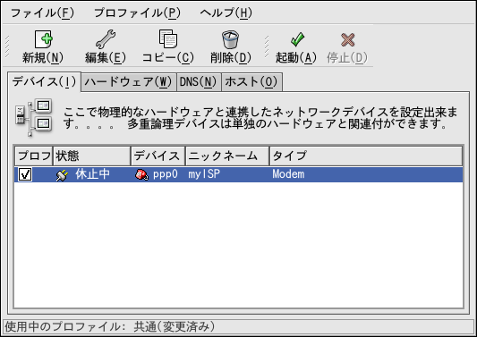 モデムデバイスの追加後に、デバイスの一覧からデバイスを選択 して編集をクリックすると、設定を 編集することができます。たとえば、デバイスを追加したときに、 デフォルトでは起動時に実行が開始されないように設定されて います。この設定を編集して変更することができます。 圧縮、PPPオプション、ログイン名、パスワードなども変更する ことができます。