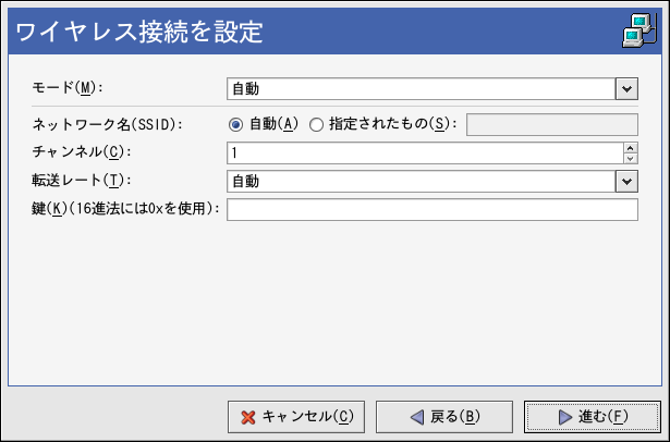 5. 他のワイヤレスカードを選択した 場合は、イーサネットアダプタの選択 ウィンドウが表示されます。イーサネットカードのメーカーと モデル、デバイス名を選択します。このカードがシステムに とって初めてのイーサネットカードなら、デバイス名に eth0を選択し、2番目ならeth1 を選択します(以降同じ)。 ネットワーク 管理 ツールを使用して、 ワイヤレスネットワークインターフェースカードのリソースを ユーザーが設定することもできます。進む をクリックして続行します。