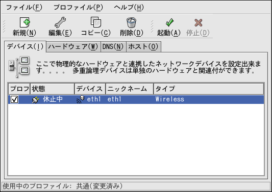 通常、インストールプログラムによって、サポートされて いるワイヤレスイーサネットデバイスが検出され、設定をする ように求められます。ワイヤレスイーサネットデバイスが インストール時に設定されている場合は、ハードウェア タブのハードウェアの一覧に表示されます。