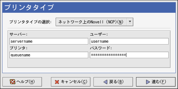 プリンタタイプの選択メニューからネットワーク上のNovell (NCP)を 選択します。