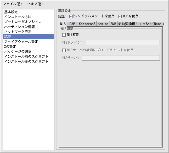 対してシャドウパスワードとMD5暗号化を使用するかどうかを選択