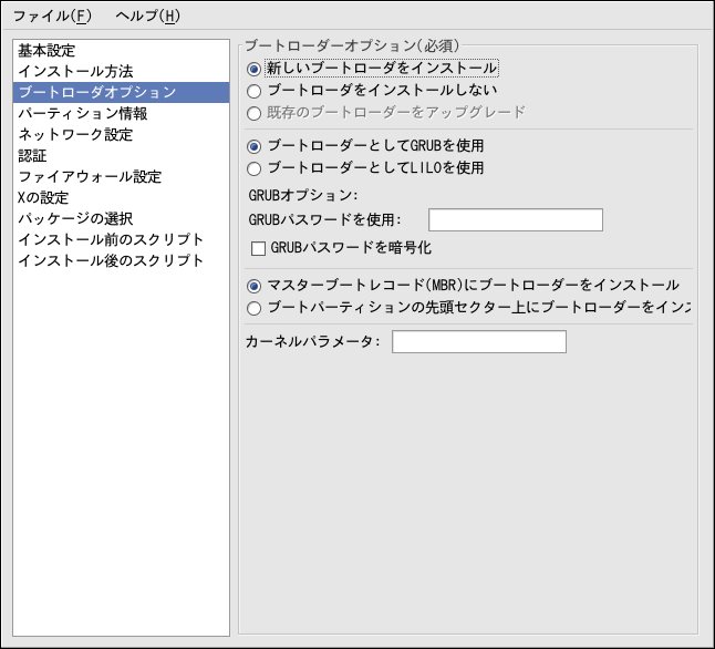 ブートローダーとしてGRUB か LILOをインストールするオプション があります。ブートローダーをインストールしない場合は、 ブートローダーをインストールしないを 選択します。ブートローダーをインストールしない選択をする 場合は、ブートディスクの作成して、または、他の方法(例えば、 他社のブートローダー)で、システムが起動できることを確認 しておいてください。