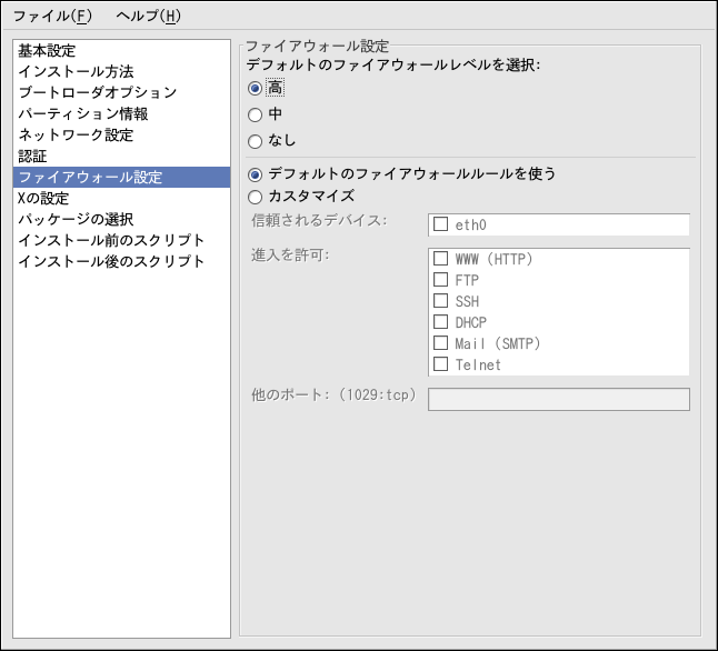 ファイアウォール設定ウィンドウは、 Red Hat Linuxインストールプログラムでの画面と セキュリティレベル 設定ツールでの画面と同じで、機能も 同様です。セキュリティレベルを高、 中、なしのいずれか で選択します。これらのセキュリティレベルについての詳細は、 項13.1を参照 してください。