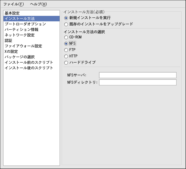 NFS — NFS共有 ディレクトリからRed Hat Linuxをインストールする場合はこのオプション を選択します。NFSサーバーとNFSディレクトリを入力する2つの テキスト入力ボックスが表示されます。NFSサーバーの完全修飾 ドメイン名またはIPアドレスを入力します。NFSディレクトリ として、インストールツリーのRedHat ディレクトリが含まれるNFSディレクトリの名前を入力します。 たとえば、NFSサーバーにディレクトリ /mirrors/redhat/i386/RedHatがある場合は、 NFSディレクトリとして/mirrors/redhat/i386 と入力します。