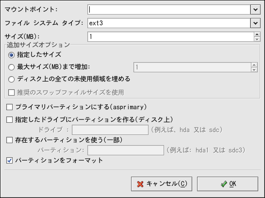 既存のパーティションを使用。たとえば、最初の IDEハードディスク(/dev/hda1)上の 最初のパーティションにパーティションを作成するには、 パーティションとしてhda1を指定します。 パーティション名に/devを入力しないで ください。