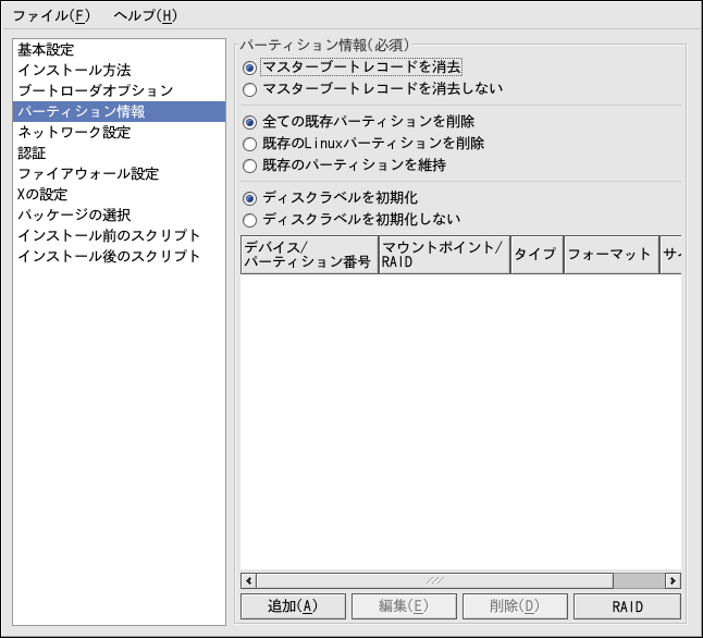 マスターブートレコード(MBR)をクリアするかどうか選択します。 また、既存のすべてのパーティションを削除、既存の全ての Linuxパーティションを削除、既存のパーティションを保存、 の中からどれかを選択することができます。